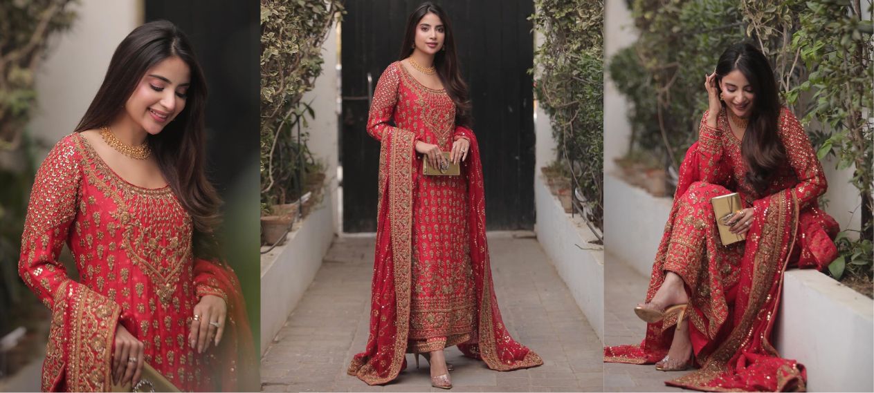 Adorned in an exquisite red outfit meticulously crafted with intricate embellishments and delicate embroidery, Saboor epitomizes elegance and grace. Her flawless appearance perfectly complements the ensemble, accentuating her radiant complexion and slender silhouette.
